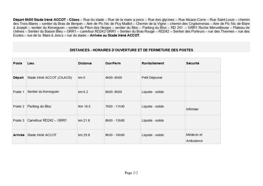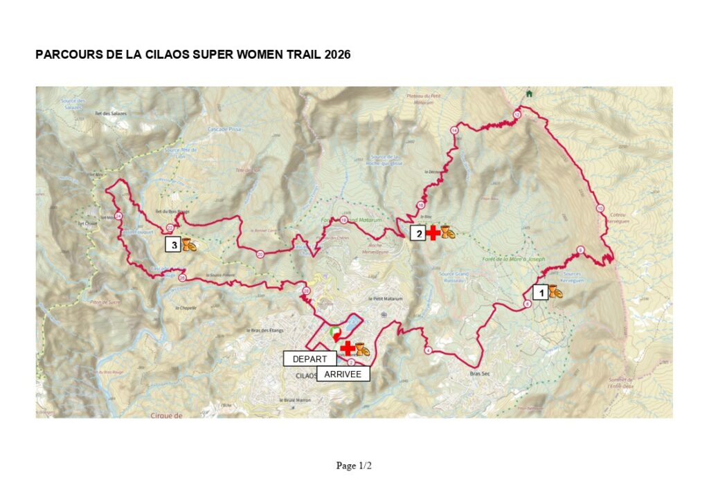La super CWT : Stade de Cilaos – Rue du stade – Rue de la mare a joncs – Rue des glycines – Rue Alsace-Corre – Rue Saint-Louis – chemin des Trois-Mares – sentier du Bras de Benjoin – Aire de Pic Nic de Puy Maillot – Chemin de la Vigne – chemin des Cryptomerias – Aire de Pic Nic de Mare à Joseph – sentier du Kerveguen – sentier du Piton des Neiges – sentier du Bloc – Parking du Bloc – RD 241 – GRR1 Roche Merveilleuse – Plateau de chênes – Sentier du Bassin Bleu – GRR1 – carrefour RD242 GRR1 – Sentier du Bras Rouge – RD242 – Sentier des Porteurs – rue des Thermes – rue des Ecoles – rue de la Mare à Joncs – rue du stade – Arrivée Stade Irené Accot.